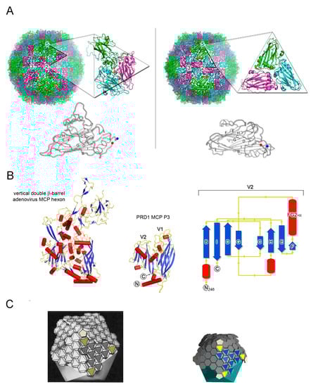The observation suggested by Rossmann and co-workers that certain viruses may share a common descent pullulated the field for some time. In 2003, thanks to the boost of viral structures determined by X-ray, Chapman and Liljas carried out a comprehensive analysis of the topology of viral protein folds available []. Significantly, they noted the recurrence of certain folds in virions belonging to distinct taxonomic viral families and postulated the ramifications that this recurrence could have for inferring phylogenetic relationships []. Nonetheless, a systematic and unifying approach through which these ideas could be tested was still lacking, at least until the X-ray structure of the MCP P3 of lipid-containing phage PRD1 was determined []. The structure showed that both bacteria-infecting PRD1 and eukaryotic-infecting adenoviruses possess a similar MCP with a vertical double β-barrel fold, a finding that opened up a treasure chest of new discoveries. This fold entails two single β-barrel connected by a short linker; each β-barrel consists of eight β-strands arranged in two four-stranded antiparallel β-sheets packed together and with their long axis perpendicular to the capsid shell (Figure 1B). In opposition to all previously studied viruses with tangential β-barrels MCPs (e.g., Figure 1A), both PRD1 and adenovirus pointed at a different capsomer morphology and organization. The capsomers displayed a pseudo-hexameric appearance generated by the trimerization of the corresponding MCPs (Figure 1C); they could also be readily fitted into the low resolution cryo-EM map of Paramecium bursaria Chlorella virus (PBCV-1), a virus infecting algae [].