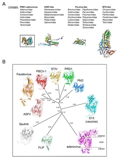 Today, the first established structure-based PRD1-adenovirus lineage accounts for over 10 virus members infecting organisms across the three domains of life (Figure 2B). Remarkably, this lineage includes ssDNA viruses such as Flavobacterium-infecting, lipid-containing phage (FLiP) [], non-icosahedral viruses such as Vaccinia [,], and virophages such as Sputnik, a satellite non-membrane-containing virus of the giant Mimivirus [], which leads us to the question of whether or when—as the descent character of the double β-barrel is present in most polintons/mavericks sequences []—polintons will be also included in the phylogentic-tree of this lineage.