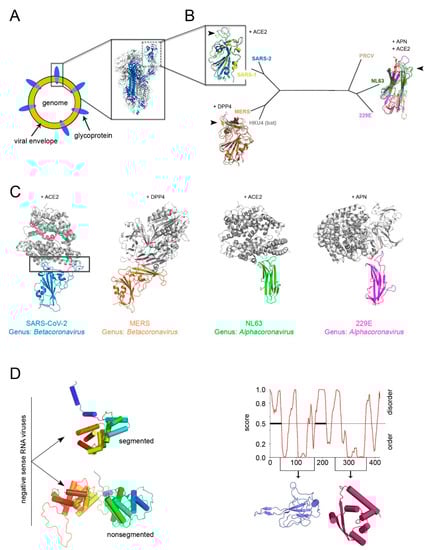 However, with the emerging of SARS-CoV-2, a further manifestation of evolution at work, the power of sequence and structural analysis has revealed in record time the determinants for the recognition of the RBD for the human angiotensin-converting enzyme 2 (ACE2) [,]. The known RBDs adopt either a twisted five-stranded antiparallel β-sheet with short connecting helices and loops or a β-sandwich (Figure 5B). Superimposition of the available RBD-receptor complexes highlights the loops connecting the β-strands as the regions more susceptible to retain mutations (so-called receptor-binding-motifs) that render the RBD the master key for operating different cellular “locks” (e.g., ACE2, aminopeptidase N (APN), dipeptidyl peptidase 4 (DDP4) but also 9-O-acetylated neuraminic acid, carcinoembryonic antigen-related adhesion molecule 1, heparin sulfate, and α-2,3-linked sialic acid []) (Figure 5B,C).
