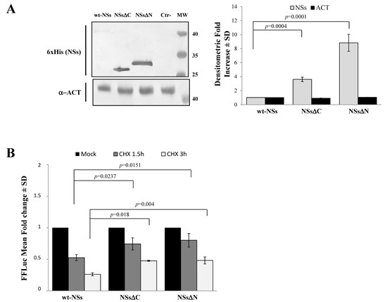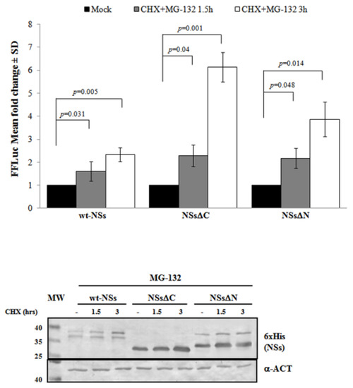 Effects of the proteasome inhibitor MG-132 on NSs deleted mutants were evaluated. (Upper panel) wt-NSs, NSsΔN, and NSsΔC expressing cells were treated with 25 μM of the inhibitors along with 100 μg/mL of CHX and collected at 1.5 and 3 h. Cell lysates were subjected to a dual-luciferase assay in order to estimate the stability of NSs protein variants. A significant increase of protein stability over time was noticed for wt-NSs, NSsΔC, and NSsΔN. (Lower panel) The immunoblotting with anti-6×His antibody or anti-ACT performed on MG-132 and CHX treated cells confirmed the stabilizing properties of the MG-132 on the NSs proteins tested. The error bars represent the standard deviation from the mean values obtained in independent experiments.