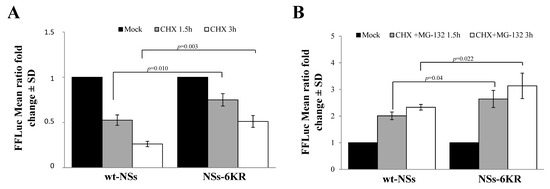 Moreover, the estimated half-life of the NSs-6KR was double (p = 0.0069) than that of wt-NSs (t1/2 3.7h vs. t1/2 1.6 h). Notwithstanding, MG-132 still affected NSs-6KR protein degradation by increasing its accumulation into the cells, leading to the conclusion that lysine residues other than those in the core region could undergo ubiquitination (Figure 6B).