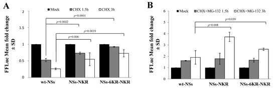 We then evaluated the presence of specific lysines, which might undergo ubiquitination in the N- or C-terminal part of the NSs protein. Two NSs variants were generated, mutating the lysine residues 9, 17, 36, 57, 59, and 69 at the amino-terminus of the wt protein (NSs-NKR) or of the NSs-6KR mutant (NSs-6KR-NKR). The CHX chase assessed to determine variations in protein stability showed that lysine residues located at the N-terminus did not significantly influence the turnover of the protein. Indeed, compared to the relative counterpart NSsΔN (Figure 2B) and NSs-6KR (Figure 6), the new NSs proteins did not exhibit a remarkable increase (p > 0.05) of protein accumulation after exposure to CHX (Figure 7A), suggesting that those sites were not critical in determining the NSs protein fate.