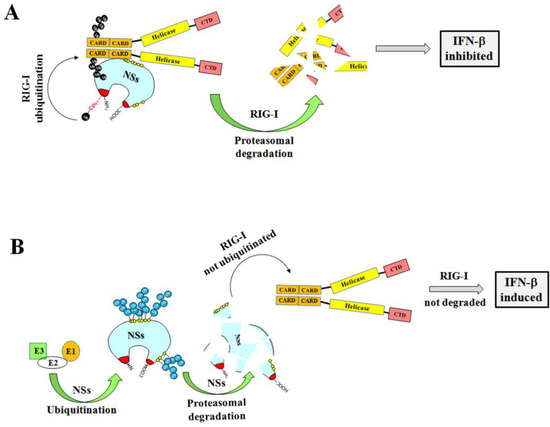 Cartoon representation of the putative function of the TOSV NSs on RIG-I-mediated interferon beta production and the influence of ubiquitination on the viral protein function. (A) The TOSV NSs protein accumulated in the cell cytoplasm efficiently interacts with RIG-I and mediates its ubiquitination and subsequent degradation, counteracting IFN-β production. On the contrary (B), the high ubiquitination rate of the NSs negatively affects its stability, targeting the protein for proteasomal degradation. Consequently, RIG-I is not depleted and the physiological secretion of IFN-β occurs.