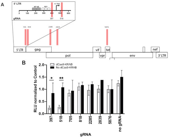 Identification of HIV-1 guide RNAs (gRNAs) that mediate disabled Cas9 (dCas9)- Kruppel-associated box (KRAB) repression. (A) Cartoon demonstrating locations targeted by gRNAs. (B) Repression of HIV transcription by gRNAs. HEK293T cells were cotransfected with NL4-3-Δenv-Luciferase, dCas9-KRAB, and the indicated guide RNAs. Negative controls included transfections with gRNAs only (black bars). HIV expression was monitored after 48 h by luciferase activity, which was normalized to control gRNA. Data represent averages of multiple experiments, with each guide being assessed in at least three independent experiments. Error bars represent standard error and Student t-test were performed to determine significance. * and ** indicate p ≤ 0.05 and p ≤ 0.01, respectively.