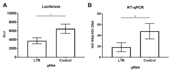 Repression of Proviral HIV transcription. HEK293T cells were infected with NL4-3-env-luciferase (MOI of 0.1) for 24 h and cotransfected with dCas9-KRAB and LTR targeting guide (397) or a scrambled control. Forty-eight hours post transfection, cells were monitored for HIV-1 expression by measuring (A) luciferase (n = 16 independent experiments) and (B) HIV-1 RNA (n = 5 independent experiments). Bars represent the mean of these results and error bars are the standard error. Student t-test was performed. * indicates p ≤ 0.01.