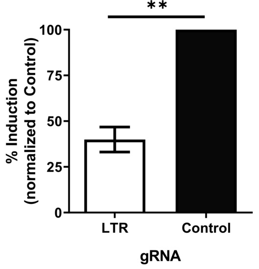 We examined if dCas9-KRAB inhibited reactivation of transcriptionally repressed latent provirus. For this experiment, we electroporated J-Lat 6.3 cells that stably express dCas9-KRAB with gRNAs. J-Lat 6.3 are a clonally selected cell line that contains a single copy of HIV-1 with GFP inserted in nef and has low basal HIV expression, which is induced in response to T cell activation and latency reversing agents []. J-Lat-dCas9-KRAB cells electroporated with specific gRNAs were stimulated with PMA plus ionomycin, and HIV-1 transcription was assessed by RT-qPCR to measure HIV-1 mRNA. RNA expression in which the LTR specific gRNA prevents induction of transcription compared to control gRNA was reduced by 60% (Figure 3). Blocking of reactivation of HIV transcription indicates that dCas9-KRAB prevents reactivation and maintains repression of latent HIV-1 provirus.