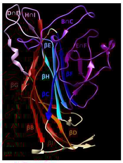 Solvent-exposed loops and β strands of JCPyV VP1. The exterior surface of VP1 is formed by the BC, DE, EF, and HI loops (shades of purple) connecting two sets of antiparallel β strands, BIDG and CHEF (shades of red and blue). Figure generated in UCSF Chimera using JCPyV VP1 structure 3NXG [,].