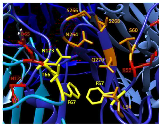 Overlap of receptor binding residues and locations of JCPyV-PML VP1 mutations. Side chains of VP1 amino acids that interact with LSTc are shown in yellow. Sites of JCPyV-PML VP1 mutations are shown in red. Residues that are both involved in LSTc binding and mutated in PML are shown in orange. LSTc interacting residues are assigned based on Neu et al. []. Indicated sites of PML mutations have been reported in several studies [,,,]. Neighboring VP1 subunits within the VP1 pentamer are denoted with shades of blue. Figure generated in UCSF Chimera using JCPyV VP1 structure 3NXG [,]. VP1 residue numbering throughout this article excludes the initial methionine.