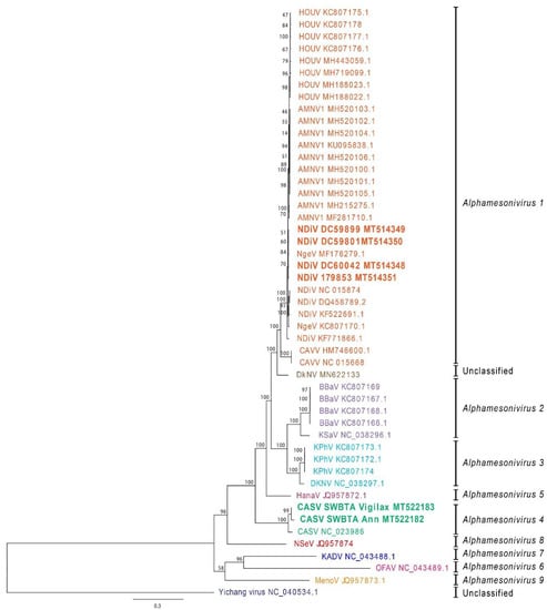 - Diagne, M.M.; Gaye, A.; Ndione, M.H.D.; Faye, M.; Fall, G.; Dieng, I.; Widen, S.G.; Wood, T.G.; Popov, V.; Guzman, H.; et al. Dianke virus: A new mesonivirus species isolated from mosquitoes in Eastern Senegal. Virus Res. 2019, 275, 197802. [Google Scholar] [CrossRef] [PubMed]
