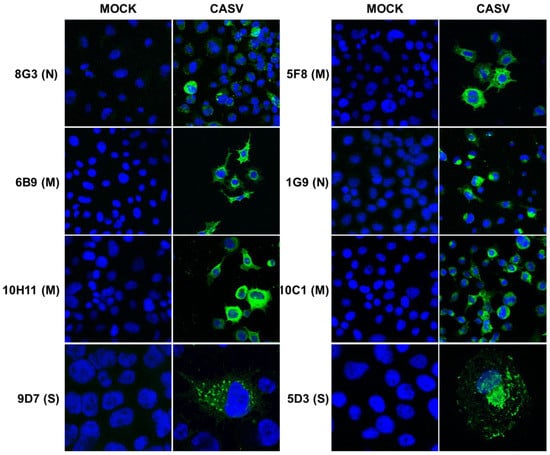 The CASV-derived mAbs were also shown to detect viral antigen by IFA in CASV-infected C6/36 cells (Figure 3). The anti-N mAbs displayed strong perinuclear staining, as too did those mAbs directed to the M protein. However, in some cases, the M-reactive mAb labelling also extended diffusely into the cell cytoplasm. The anti-spike protein mAbs facilitated the observation of spike protein labelling throughout the cellular secretory pathway (Figure 3).