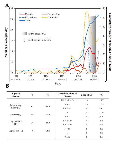 Clinical signs monitored from 5 March 2018 to 22 April 2018 in a group of 64 horses from a single stable block in the premises (A). The left axis represents the number of cases per day with pyrexia, depression, leg oedema or general clinical signs; the right axis represents the total number of horses affected each day (blue line). Frequency of horses showing a sign of disease, alone or in combination, is presented in (B).