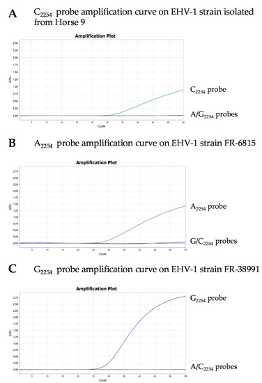 Real-time PCR amplification curves using C2254 probe (green curve) and both A2254 (red curve) and G2254 (blue curve) probes on a 145 bp fragment of the ORF30 for the typing of an EHV-1-positive sample from the premises described in Section 3.1 (C2254) (A), EHV-1 strains FR-6815 (A2254) (B) and FR-38991 (G2254) (C). Simplex amplification curve (C2254) and multiplex amplification curves (A/G2254) are combined in each graph.