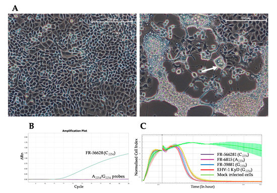 Microscopic observation of RK13 cell monolayer without (left) or with infection with the EHV-1 strain FR-56628 (120 hpi; right). Microscope lens: ×20. Scale bar: 100 µm. White arrow indicates an example of syncytia formation (A). Amplification curves for the EHV-1 strain FR-56628 detected with the C2254 probe (B). Real-time cell analysis of EEK cells infected with EHV-1 strains FR-56628 (C2254; yellow curve), FR-6815 (A2254; purple curve), FR38991 (G2254; blue curve), and reference strain KyD VR700TM (G2254; red curve) at a multiplicity of infection (MOI) of 0.05, in comparison with mock infected cells (green curve) (C).