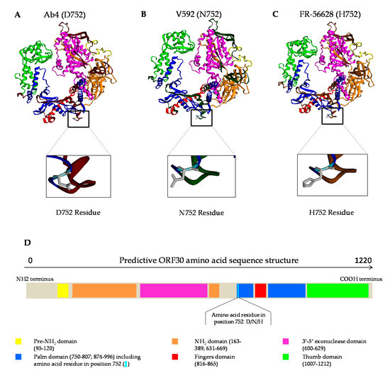 Three-dimensional models of EHV-1 strains Ab4 (D752) (A), V592 (N752) (B) and the newly isolated EHV-1 strain FR-56628 (H752) (C). ORF30 amino acid sequences based on their homology with HSV-1 DNA polymerase and predictive structure of the ORF30 amino acid sequence (D).