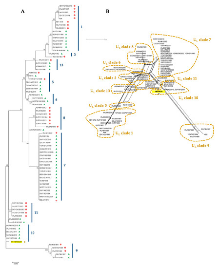 ORF30 position 2254 sequencing was performed using Allen et al. (2007) PCR primers (Supplementary Table S2). Amplification PCR (PCR 4) was performed using Phusion Hot Start II DNA Polymerase (2 U/µL) chemistry (Thermo Fisher Scientific). Amplicons were purified using a QIAquick PCR Purification Kit® (Qiagen). Sequencing PCR (PCR 5) was performed using a BigDye™ Terminator v3.1 Cycle Sequencing Kit (Thermo Fisher Scientific). All details are described in Supplementary Table S2. Sequencing products were purified using a ZR DNA Sequencing Clean-Up® Kit (Zymo Research, Irvine, CA, USA) and electrophoresis was performed using the 3500 Genetic Analyser® (Thermo Fisher Scientific). Complete ORF30 sequencing was performed by BIOFIDAL (Vaulx-en-Velin, France), as previously described [22] (Supplementary Table S3 and Figure S3). Sequences were analysed using BioEdit version 7.0.5.3 (Tom Hall, Carlsbad, CA, USA) [34]. A median joining network based on ORF30 was built using Population Analysis with Reticulate Trees (PopART) software (Jessica Leigh, David Bryant and Mike Steel, Dunedin, New Zealand) [35].