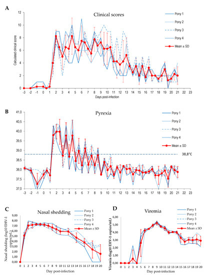 Rectal temperature (RT) was recorded twice a day from Day −5 to Day +21 post-infection (pi). Pyrexia was defined as a rectal temperature exceeding 38.8 °C. Clinical scores were recorded twice a day from Day −5 to Day +21 for cough, attitude, nasal discharge, ocular discharge, mandibular lymph node enlargement, ataxia and other signs of neurological disease. The cumulative clinical score after experimental infection with EHV-1 was calculated using the score for each clinical sign, according to the formula used and reported previously for equine influenza virus infection in Welsh mountain ponies, with some minor modifications [45]: