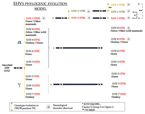 Based on the amino acid in position 752 (or equivalent) of DNA polymerase gene comparison between several herpesviruses, including the eight known equid herpesviruses (EHV-1, 2, 3, 4, 5, 7, 8 and 9), as already pointed out by Nugent et al. (2006), D752 (or an equivalent position in other herpesviruses) appears to be a highly conserved amino acid amongst the Herpesviridae family (Supplementary Figure S11) [17]. It has been suggested that D752 strains are more likely to be ancestral strains from which N752 would have evolved, as shown in Figure 9, in which the G2254 strain KENT/64/1994 (see Figure 6) was proposed to have evolved from an A2254 strain from group 2 cluster 2. All of the sequences compared carried an aspartic acid (D) at this position, with the exception of numerous EHV-1 strains (with V592 as a representative N752 EHV-1 strain) and EHV-1 FR-56628, the only H752 strain described to date [30]. To our knowledge, asparagine (N) and histidine (H) are the only two other amino acids identified in equid herpesviruses’ DNA polymerase gene in position 752. In addition, a study showed that N752 strains (isolated from abortion) could infect equally monocytic CD172a+ cells and T lymphocytes, whereas D752 strains (isolated from neurological cases) could infect CD172a+ cells in a larger proportion than T lymphocytes. In accordance with other studies, the authors suggested that N752 had adapted its immune evasion strategy after co-evolving from D752 strains with the host immune system [52,54,55]. Concerning the genotype/pathotype association suggested by Nugent et al. (2006), it was followed by a statistical report by Perkins et al. performed on 176 EHV-1 isolates, showing a strong but not strict association between G2254/D752 strains and neurological disease, and A2254 strains and abortion disease. According to the authors, the probability of neurological disease being associated with G2254/D752 strains was 162 times greater than the probability of it being associated with A2254/N752 strains [56]. Several studies then showed that this genotype/pathotype association is not exclusive [21,22,57,58,59]. The discovery of a third genotype C2254/H752 and its potential association with neurological signs makes the understanding of the genotype/pathotype association even more complex. EHV-1 is the only equid herpesvirus known to have possibly evolved from D752 strains to N752 and H752 strains. Along with EHV-8 and EHV-9, these three viruses are also the only equid herpesviruses to our knowledge that have been reported as causing neurological diseases. This observation is in line with other statements suggesting that the amino acid in position 2254 is not the only determinant for neurovirulence and could also depend on the environment (air quality, stress, training management, etc.), the immune status of the horse and its genetic background [9,56,60].