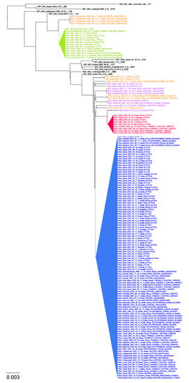 - Price, M.N.; Dehal, P.S.; Arkin, A.P. FastTree 2—Approximately maximum-likelihood trees for large alignments. PLoS ONE 2010, 5, e9490. [Google Scholar] [CrossRef]