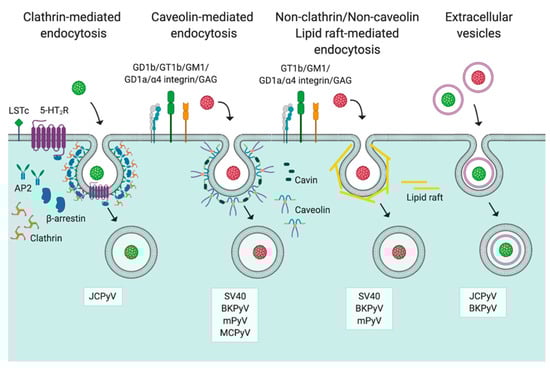 Most often, the initiation of viral infection is mediated by interactions between viruses and specific cellular factors facilitating viral attachment []. Attachment can directly induce structural conformational changes or activate specific signaling pathways to allow for uptake of the virus within the cell [,]. Because of this, more than one receptor may be necessary to allow for coordination of virus entry. Furthermore, interactions with cellular receptors largely dictate the signaling networks critical for delivery of the virus to the appropriate cellular compartment, ensuring replicative success []. Many viruses utilize attachment factors such as sialic acid-containing receptors including glycoproteins or glycolipids, or glycosaminoglycans and integrins (Figure 1), and this conserved attachment strategy extends to polyomaviruses [,].