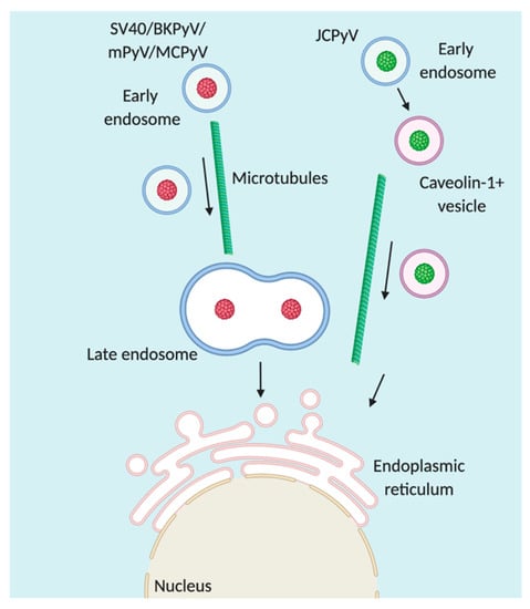 Intracellular trafficking of polyomaviruses. After internalization of polyomaviruses into the cell, they are targeted to the endoplasmic reticulum (ER). Upon internalization of SV40, BKPyV, mPyV, or MCPyV (red virion, collectively) into a pH neutral early endosome, the virus is delivered to the ER via microtubule-mediated transport and the late endosome/lysosome. Meanwhile, upon internalization of JCPyV (green virion) into an early endosome, association with caveolin-1+ vesicles occurs prior to retrograde transport to the ER. Figure created with BioRender.com.