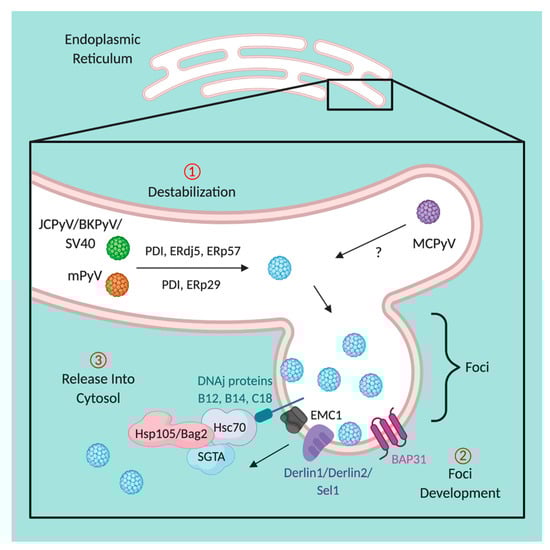 Release of polyomaviruses from the ER to the cytosol. (1) Upon arrival of polyomaviruses JCPyV, BKPyV, SV40 (green virion, collectively), mPyV (orange virion), and MCPyV (purple virion) in the ER, the viral capsids are destabilized due to reduction and isomerization of disulfide bonds by ER redox proteins, PDI, ERdj5, ERp57, or ERp29. Destabilization of MCPyV remains elusive (indicated by ‘?’). (2) The now-hydrophobic particle embeds itself in the ER membrane and is stabilized by EMC1, preventing further disassembly of the viral capsid. As demonstrated by SV40 (potential pathway of PyV convergence indicated by blue virion), localization of the virus in the membrane of the ER induces the relocation of DNA J proteins (B12, B14, C18) and BAP31 to the site, forming a foci. (3) Direct interactions between DNA J proteins and cytosolic extraction machinery (Hsc70, HSP105, Bag2, and SGTA) form a complex, and with the assistance of derlin1, derlin2, or sel1, facilitate the extraction of the virus across the ER membrane and into the cytosol, primed for arrival at the nucleus. Figure created with BioRender.com.