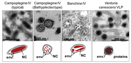 Morphological differences between virus particles found in ichneumonid wasps. Upper panel. Transmission electron micrographs of female oviduct transversal sections; particles shown are observed in the calyx lumen for campoplegine IVs (typical and Bathyplectes types) and Venturia canescens VLPs; particles are shown in the nucleus of calyx cells for banchine IVs. Lower panel. Schematic representation of the secreted particles. cyt, cytoplasm; env., particle envelopes, NC, nucleocapsid.