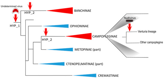 Schematic diagram illustrating virus acquisitions during ichneumonid evolution. A virus of undetermined nature was captured by an ichneumonid ancestor. It is not known whether the same event of integration (hypothesis HYP-1) or two distinct events with related viral progenitors (hypothesis HYP-2) led to the ichnoviruses presently associated with campoplegine and banchine. Remarkably, virus particles were described in the Campopleginae and Banchinae (indicated in red), but never in other ichneumonid subfamilies (indicated in blue). Subsequently, another event of virus integration occurred in the Venturia lineage of the campoplegine subfamily: an alphanudivirus was captured, giving rise to the virus-like particles described in the species Venturia canescens. Schematic phylogenic tree drawn based on Bennett et al., 2019 [1].