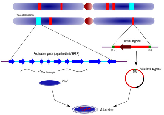 Genomic architecture of ichnoviruses. Ichnovirus loci are dispersed within the wasp chromosomes and comprise the proviral genome segments and the clusters of replication genes (or IVSPERs, for IV structural proteins encoding regions). The first are the linear templates of the circular molecules that are packaged in IV particles. They are flanked at each side by direct repeated sequences (named DRJ for “direct repeat junction”) allowing circularization of the molecule. The replication genes are transcribed in the wasp replicative tissue (calyx) and are involved in the production of the particle. See text for more details.
