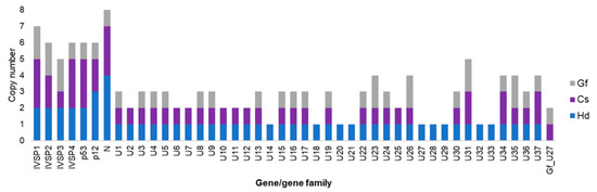 Globally, IVSPERs are far less numerous than proviral segments [30]. The H. didymator genome contained one isolated IV replication gene and five IVSPERs (with sizes varying from 2 to 27 kb and a number of genes ranging from 2 to 19), adding up to 54 predicted replication genes. Similarly, the C. sonorensis genome was observed to harbor 48 IV replication genes, including two isolated genes and 46 genes clustered in five IVSPERS (varying in size from 9 to 33 kb and containing from 3 to 19 genes). Regarding the nature of the replication genes, the majority (~80%) were shared by H. didymator and C. campoletis (Figure 5). Note that some genes were present in duplicates or triplicates, with the number of copies differing in some cases between the two wasp species. Interestingly, most of these genes are also conserved in the banchine species G. fumiferanae (Figure 5).
