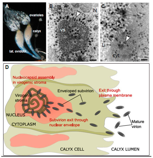 Ichnovirus morphogenesis. (A) Light microscopy view of the ovaries of a campoplegine wasp. The calyx region corresponds to the apical part of the lateral oviducts, just below the ovarioles where oogenesis takes place. (B) Transmission electron micrograph showing details of a calyx cell nucleus (N). Enveloped virions (arrowhead) are being assembled at the vicinity of the virogenic stroma (VS). Scale bar 500 nm. (C) Detail of the cytoplasm (cyt.) of a calyx cell presenting numerous virions (white arrowhead) that bud at the plasma membrane (PM) and accumulate as mature virions surrounded by two envelopes (grey arrowhead) in the calyx lumen (L). Scale bar 500 nm. (D) Schematic representation of the different steps of IV particle production in the wasp calyx cells.