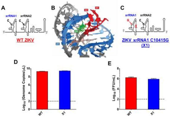 As previously described, a highly conserved cytosine (nt 10415) located in the P2′ region of ZIKV xrRNA1 secondary structure is necessary for anti-exoribonuclease activity (Figure 1A) [,,,,]. In the tertiary structure of xrRNA1, this cytosine forms several bonds that stabilize the phosphate backbone kink essential to inhibiting degradation by host exoribonucleases (Figure 1B). Replacing C10415 with a guanine is predicted to disrupt the tertiary structure of xrRNA1 without significantly altering the sequence (Figure 1C). We used site-directed mutagenesis to create an infectious cDNA clone of Puerto Rican strain PRVABC59 with a single nucleotide substitution C10415G, termed the ZIKV X1 mutant. Sanger sequencing confirmed the presence of the X1 mutation. To rescue infectious virus, Vero cells were transfected with RNA transcribed from the PRVABC59 clone with either the X1 mutation (X1) or no mutations (WT). Following transfection, we determined ZIKV genome copies present in the supernatant of transfected cells to evaluate X1 virus replication. We found that both WT and X1 transfections produced a mean of 2.3 × 1012 viral genome copies per mL with no significant difference between the WT (1.9 × 1012, ±1.6 × 1011 SEM) and X1 clones (2.7 × 1012, ±9 × 1010 SEM, p = 0.1, paired t-test, Figure 1D). Additionally, there was no significant difference in the amount of infectious WT and X1 virus as measured by a focus forming unit assay (FFU). In this assay, we found that the transfection of ZIKV produced 1.7 × 106 FFU per mL (±2.9 × 105 SEM) of supernatant, while X1 produced 8.7 × 105 FFU per mL (±1.3 × 105 SEM) (p = 0.1, paired t-test, Figure 1E). These results indicate that the X1 mutation did not significantly alter viral production after transfection and rescue of infectious clones; however, there was a trend toward less infectious viral particles in the clone-derived X1-mutant virus.