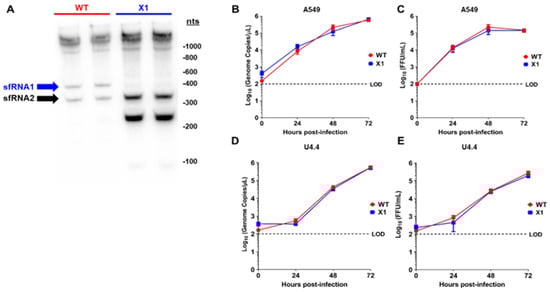 In vitro sfRNA production and viral growth kinetics of ZIKV X1 compared to WT ZIKV clone. (A) A549 cells were infected with either X1 or WT clone at a MOI of 1. At 48 h post infection (HPI), cellular RNA was collected and the presence of ZIKV sfRNAs was detected in two biological replicates per infection via Northern blot using a ZIKV 3′ UTR-specific probe. To analyze viral growth kinetics, human A549 cells (B), (C) or Aedes albopictus U4.4 cells (D), (E) were infected with X1 or WT at an MOI of 0.1. At 0, 24, 48, and 72 HPI, supernatant was collected and used to measure either extracellular viral RNA via RT-qPCR (B–D) or infectious virus via FFU assay (C–E). (B–E) Dashed lines represent the limit of detection (LOD). Error bars indicate standard error of the mean for six replicates across two independent experiments. (n = 6, NS by two-way ANOVA).