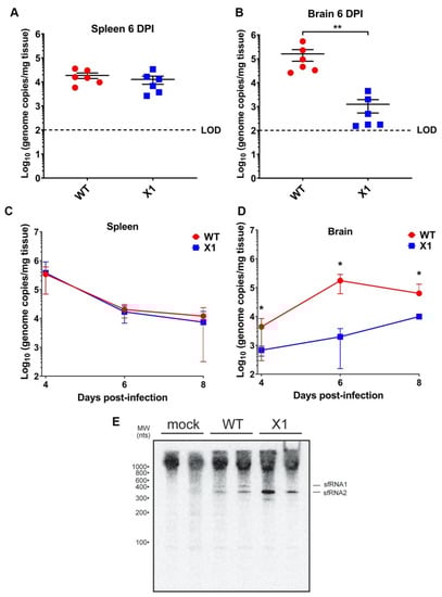 X1 ZIKV exhibits tissue-specific attenuated viral replication in Ifnar1−/− mice. Male and female mice were infected with 1e4 FFU (IP) of either WT or X1 virus. At the indicated days post-infection, mice were sacrificed and perfused with PBS before harvesting the spleen (A–C) and brain tissue (B–D). Total RNA was isolated from the tissue and used to quantify ZIKV genome via RT-qPCR. Dotted line represents the limit of detection (LOD). The presence of sfRNA in infected spleens from 2 DPI was determined via northern blot (E). Error bars indicate the standard error of the mean for six replicates across two independent experiments. [n = 6 per group, ** p < 0.001 by Mann-Whitney test (B) and two-way ANOVA, * p < 0.01 (D)].