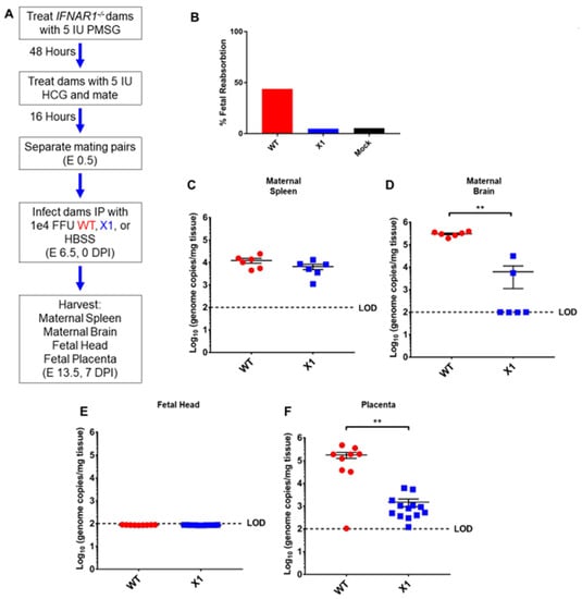 Superovulation was induced in female Ifnar1−/− mice aged 10–12 weeks, as previously described []. Dams were mated with Ifnar1−/− sires for approximately 16 h and then separated (E0.5). At E6.5, dams were infected intraperitoneally with 1 × 104 FFU of either X1 or WT ZIKV or 100 microL (µL) HBSS as a mock infection. Seven DPI on E13.5, mice were sacrificed using isoflurane, perfused with 20 mL PBS, and maternal brain and spleen were collected. The fetal outcome was assessed by the number of fetuses and resorptions present and the fetal head and placenta were collected to determine viral burden. All samples were stored in RNAlater solution (ThermoFisher) at 4 °C until processing.