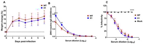 Male and female 5–7-week-old HuSTAT2 mice were infected intraperitoneally with 1 × 104 FFU of either X1 or WT ZIKV or 100 µL HBSS as a mock infection. The weight of the infected animals was monitored daily. Mice were euthanized with isoflurane at 20 DPI and blood was collected via cardiac puncture. Serum isolated from the blood samples was used to determine the amount of ZIKV-reactive IgG present via indirect ELISA as well as viral neutralization by focus reduction neutralization test (FRNT).