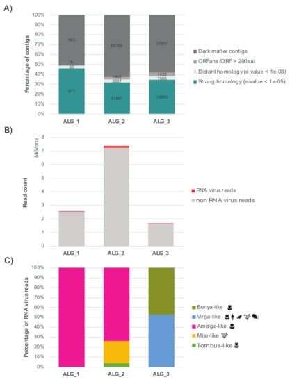 As the algal cultures analyzed here were not axenic, we assessed the diversity and relative abundance of other potential eukaryotic organisms in these samples. Indeed, algae cultures are commonly co-cultured with bacteria, fungi and other endosymbiotic algae []. The rRNA depletion performed during the RNA-Seq library preparation prevented us from using standard 16S/18S profiling. We therefore evaluated the presence of other eukaryotes in the samples using CCMetagen []. According to the Krona plots obtained for each library, cultivated algae were, as expected, the dominant organism found in the samples, representing between 79–99% of all assigned contigs (Files S1–S3). Nevertheless, a small proportion (2–8%) of contigs from ALG_1 and ALG_3 were assigned to dinoflagellates and Cyanophora algae (Files S1 and S3). Although sequences assigned to Lingulodinium polyedrum potentially result from GenBank mis-annotation and were likely of bacterial origin, the Coolia malayensis (Dinophyceae), Amphidinium sp. (Dinophyceae) and Cyanophora paradoxa (Glaucophyta) associated sequences likely constitute true assignments. We therefore suspect that these additional micro-eukaryotic transcripts may have arisen from cross-contamination with additional algae samples that were extracted and prepared at the same time and sequenced in the same run. Importantly, however, none of the viruses identified in the three libraries studied here could be detected in the transcriptomes of co-processed Dinophyceae and Glaucophyta cultures, suggesting that these low-abundance contaminants are not the hosts of the viruses reported here. In addition, a minor portion of the contigs in ALG_2 and ALG_9 was assigned to bacterial species (0.3% and 5%, respectively; Supplementary Files S2 and S3). To prevent any misinterpretation, particular care was taken to remove bacteriophage-like signals from the final virus-like sequence files.