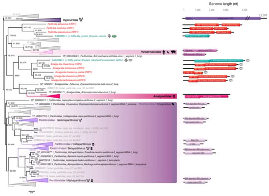 RdRp phylogeny of the newly identified chlorophyte viruses among the Amalgaviridae, Partitiviridae, Picobirnaviridae and Hypoviridae. Sequences identified in this study are labeled in red. Unclassified sequences from [] are highlighted in grey. For clarity, some families and genera have been collapsed. Left, phylogenetic tree estimated using IQ-Tree with bootstrap replicates and SH-aLTR set to 1000 (values in parenthesis). Right, genomic organization of both viral genomes identified in this study (red) and representative species of each major family and genus used in the phylogeny (Cryphonectria hypovirus 2—Hypoviridae; Chicken picobirnavirus—Picobirnaviridae; Southern tomato virus—Amalgaviridae; Cryptosporidium parvum virus 1—Cryspovirus; Discula destructiva virus 1—Gammapartitivirus; Figure cryptic virus—Deltapartitivirus; Ceratocystis resinifera partitivirus—Betapartitivirus; White clover cryptic virus 1—Alphapartitivirus. The tree is mid-pointed rooted and branch lengths are scaled according to the number of amino acid substitutions per site.