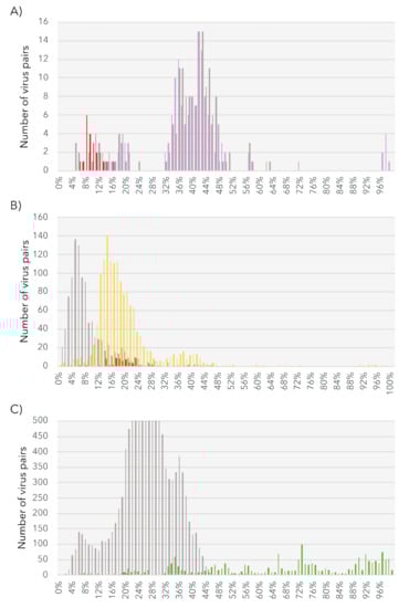 Genome pairwise identity distributions of the new algal viral sequences. The level of pairwise identity between the newly identified viruses and existing members of each viral family are represented in red. (A) Intergenus (grey) and intra-genus (purple) identity levels within the Amalgaviridae. (B) Intergenus (grey) and intra-genus (yellow) identity levels within the Narnaviridae. (C) Intergenus (grey) and intra-genus (green) identity levels within the Tombusviridae.