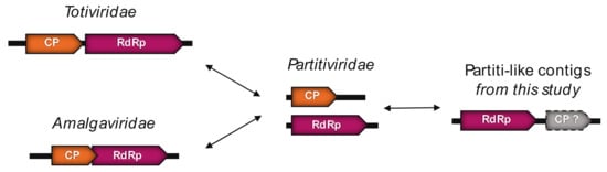 Indeed, the RdRp encoded by the Partiti-like ALG_2 contigs is close to the 5′ extremity, followed by a second ORF. This second ORF could potentially encode a CP, although functional annotation could not be achieved due to the high level of sequence divergence.