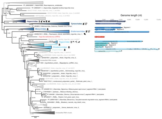 Phylogeny of the Hepe-Virga group RdRp. The hepe-virga-like sequence identified in this study is labeled in red. Unclassified sequences from [] are highlighted in grey. For clarity, some families or genera have been collapsed. Left, RdRp-based phylogenetic tree obtained using IQ-tree with bootstrap replicates and SH-aLTR set to 1000 (values in parenthesis). Right, genomic organizations of the new viruses as well as closest homologs and representative species from each family/genus as follows: Orthohepevirus A (Hepeviridae); Poinsettia mosaic virus (order Tymovirales); Wheat stripe mosaic virus (Benyviridae); Diatom colony associated dsRNA virus 15 (Endornaviridae); Cabassou virus (Togaviridae); Apple mosaic virus (Bromoviridae); Mint virus 1 (Closteroviridae); Cucumber mottle virus (Virgaviridae). The tree is mid-pointed rooted and branch lengths are scaled according to the number of amino acid substitutions per site.
