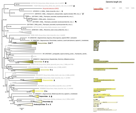 Phylogeny of the Bunyavirales RdRp. The bunya-like sequence identified in this study is labeled in red. Unclassified sequences from [] are highlighted in grey. For clarity, some families and genera have been collapsed. Left, phylogenetic tree estimated using IQ-Tree with bootstrap replicates and SH-aLTR set to 1000 (values in parenthesis). Right, genomic organizations of the new viruses as well as their closest homologs and representative species from each family/genus as follows: Melon chlorotic spot virus (Phenuiviridae); Yogue virus (Nairoviridae); Latino mammarenavirus (Arenaviridae); Seattle orthophasmavirus (Phasmaviridae); Melon yellow spot virus (Tospoviridae); Fig mosaic emaravirus (Fimoviridae); Tataguine orthobunyavirus (Peribunyaviridae). The tree is mid-pointed rooted and branch lengths are scaled according to the number of amino acid substitutions per site.