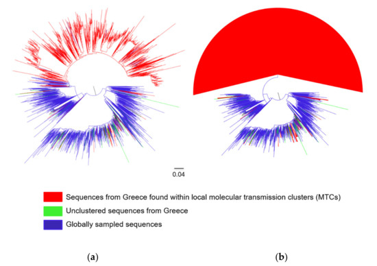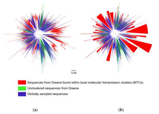 - Kostaki, E.G.; Frampton, D.; Paraskevis, D.; Pantavou, K.; Ferns, B.; Raffle, J.; Grant, P.; Kozlakidis, Z.; Hadjikou, A.; Pavlitina, E.; et al. Near Full-length Genomic Sequencing and Molecular Analysis of HIV-Infected Individuals in a Network-based Intervention (TRIP) in Athens, Greece: Evidence that Transmissions Occur More Frequently from those with High HIV-RNA. Curr. HIV Res. 2018, 16, 345–353. [Google Scholar] [CrossRef] [PubMed]