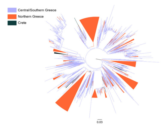 To investigate the patterns of virus spread among different geographic areas in Greece, we performed phylogeographic analysis on the sequences found within MTCs that were generated in Athens and sampled from most areas in Greece (area 1), were generated in Thessaloniki and sampled from Northern Greece (area 2), and a small sample of sequences from Crete also generated in Thessaloniki (area 3). Phylogeographic analyses suggested that the total number of viral migration events corresponding to transmissions among the three different areas was 181 (median value; IQR: 178–184) and 136 (median value; IQR: 134–138) for subtypes A1 and B, respectively. These numbers were significantly lower than the total number of viral migrations expected by chance under the simulated scenario of panmixis (i.e., random mixing of sequences assuming that the level of regional transmission is negligible). Specifically, the total number of viral migrations under panmixis were 398 (median value; IQR: 394–402) and 259 (median value; IQR: 257–262) for subtypes A1 and B, respectively, and were significantly higher than the estimated values for the bootstrap trees for both subtypes (p < 0.001). These findings suggest that transmissions occur at the regional level; a conclusion that can also be drawn by the visual inspection of the trees, where the existence of several regional clusters is obvious (Figure 3).