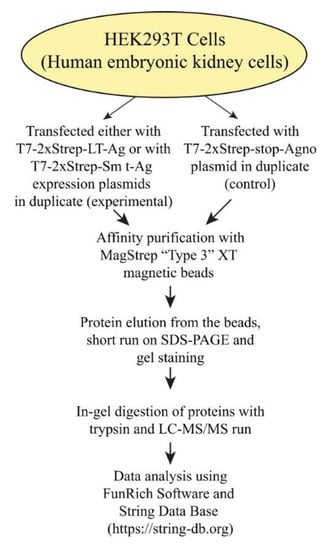 At 24 h post-transfection, whole-cell extracts (WCE) were prepared from the transfected and untransfected HEK293T cells. Briefly, cells were washed with 1× PBS twice, lysed in 2 mL of TNN buffer (50 mM Tris-HCl (pH 7.4), 150 mM NaCl, 1 mM EDTA, and 1.0% NP-40 in the presence of protease inhibitors (Sigma, St. Louis, MO, USA, catalog no. P8340)), collected, and incubated at 4 °C on a rocking platform for 30 min. The cell lysates were then cleared by centrifugation at 17,000× g for 10 min at 4 °C. The NP-40 concentration in the whole-cell extracts (control and experimental) were adjusted to 0.3% (30 milligram total protein) and incubated with 150 µL of MagStrep “Type 3” XT magnetic beads (IBA Lifesciences, Göttingen, Germany, catalog no. 2-4090-002) at 4 °C for 16 h on a racking platform to capture T7-2xStrep-tagged LT-Ag and Sm t-Ag along with LT-Ag- and Sm t-Ag-bound proteins. As a control, 1 µg of T7-2xStrep peptide was also incubated with “the control extract” during the protein purification steps. LT-Ag- and Sm t-Ag-interacting protein complexes were then washed in TNN buffer containing 0.3% NP40 by using a bead-capturing magnet system (“DynaMag”, ThermoFisher, Waltham, MA, USA, catalog no. 12321D) and eluted in the same buffer containing 50 mM biotin for proteomics studies. This affinity purification of the LT-Ag- and Sm t-Ag-interacting proteins was repeated using extracts prepared from other independently transfected cells.
