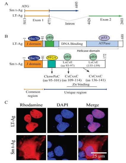 - Rundell, K.; Parakati, R. The role of the SV40 ST antigen in cell growth promotion and transformation. Semin. Cancer Biol. 2001, 11, 5–13. [Google Scholar] [CrossRef]