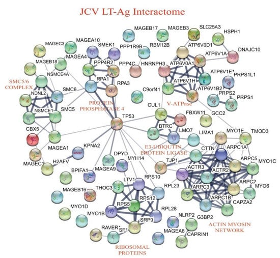 Building an interactome map for the host proteins targeted by JCV LT-Ag using “STRING database”. Analysis of the JCV LT-Ag interactome using the STRING database showed that JCV LT-Ag targets various protein complexes and networks including V-ATPase, Smc5/6 complex, PP4–PP1 complex, E3-Ubiquitin-protein ligase, ribosomal proteins, actin-myosin network, and others (Table 3).