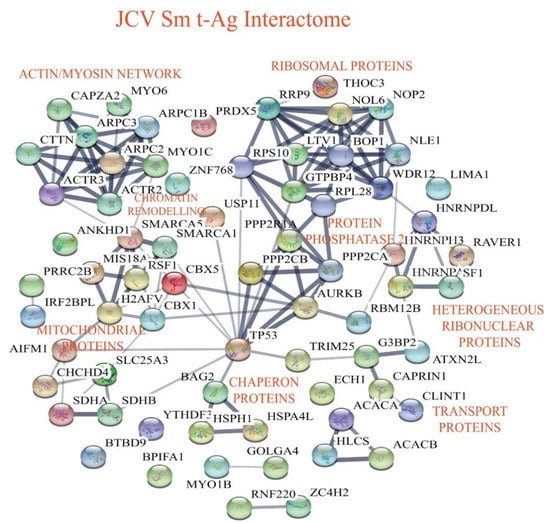 Analysis of the JCV Sm t-Ag interactome using “STRING database”. JCV Sm t-Ag primarily targets chromatin-remodeling proteins, mitochondrial proteins, PP2A complex proteins, chaperone proteins, Zn-binding proteins, heterogeneous ribonuclear proteins, ribosomal proteins, actin-myosin network, and others (Table 4).