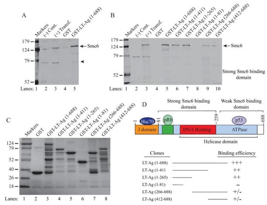 The C-terminal region of JCV LT Ag (aa 266-688) (lanes 9 and 10) also showed a weak interaction, suggesting that JCV LT-Ag might contain two SMC binding domains required for the interaction with Smc6: A strong interaction domain encompassing aa 82–266 at the N-terminus and a weak interaction domain encompassing aa 412–688 at the C-terminus. The SDS-PAGE analysis of the full-length GST-JCV LT-Ag and that of the deletion mutants, where truncated forms of JCV LT-Ag fused to GST, is shown in Figure 7C. The strengths of JCV LT-Ag domain interactions with Smc6 based on the GST pull-down assays are depicted graphically in Figure 7D.