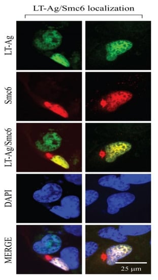 In parallel, we also performed immunocytochemistry (ICC) to support our findings from the GST pull-down experiments. For this purpose, SVG-A cells were co-transfected by both a JCV LT-Ag and a flag-tagged Smc6 expression plasmids, and ICC experiments were performed, as described in Materials and Methods. As shown in Figure 8, both JCV LT-Ag and Smc6 showed a nuclear and overlapping localization, which is consistent with our findings from the protein–protein interaction assays (GST pull-down, Figure 7). Additionally, the proteins that were previously shown to interact with JCV LT-Ag are tabulated on Table 2. Some of those proteins were revalidated by our current proteomics data, including p53, Yb-1, F-box protein (BTrCP1/2), etc. Interestingly, our proteomics data did not detect an interaction between LT-Ag and pRb under our experimental conditions. It is likely that such an interaction was not stable in our experimental conditions.