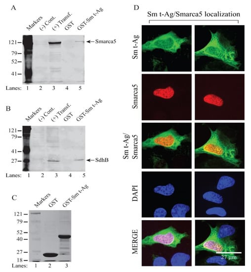 We also further validated the interaction of Sm t-Ag both with Smarca5 and SDHB proteins by protein–protein interaction studies. Some proteins that were previously shown to interact with Sm t-Ag are also tabulated on Table 1. Some of those proteins were also revalidated by our proteomics data, including PP2A, Hps70, etc. To further validate the interaction of Sm t-Ag with either Smarca5 or SDHB, we performed GST pull-down experiments using whole-cell extracts prepared from HEK293T cells expressing a flag-tagged Smarca5 (Figure 9A, lane 5) or flag-tagged SDHB (Figure 9B), as described in the Figure 9 legend. Both assays clearly demonstrated that JCV Sm t-Ag specifically interacts with both Smarca5 (Figure 9A) and SDHB (Figure 9B), which is evident from the fact that no visible interaction was observed with GST alone in both cases. Analysis of the GST-Sm t-Ag fusion protein by coomassie blue staining is shown in Figure 9C. In parallel to the GST pull-down assays, the cellular distribution patterns of Sm t-Ag along with Smarca5 (Figure 9D) were also analyzed by microscopy imaging assays. SVG-A cells were co-transfected with both a JCV Sm t-Ag and flag-tagged Smarca5 expression plasmids. The immunocytochemistry experiments were performed, as described in Materials and Methods. As shown in Figure 9D, as expected, Smarca5 shows an exclusive nuclear localization pattern, indicating an interaction with JCV Sm t-Ag in the nucleus.